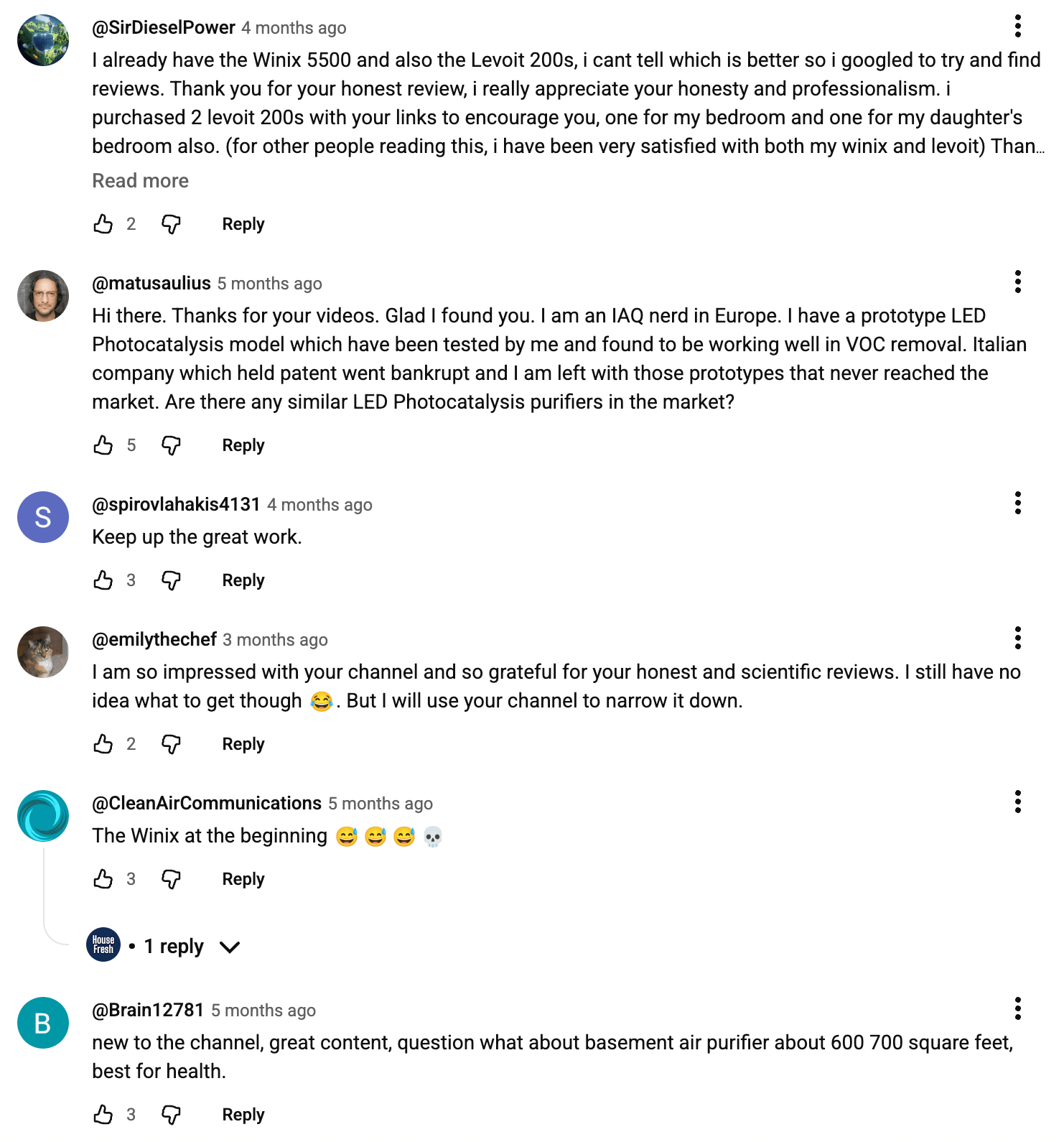 With YouTube, the first comment was negative, but even that was feedback. I’ve learned a lot about air purifier technology from the comments, especially the more technical aspects that are hard to learn from the web. There are incredibly knowledgeable people on YouTube writing detailed replies and explaining things.